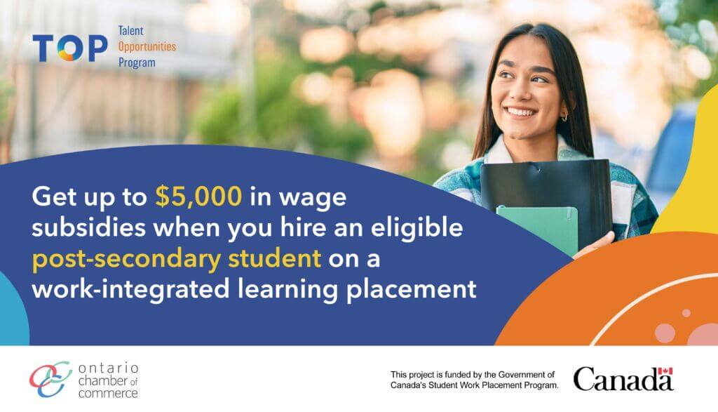 In partnership with the Ontario Chamber of Commerce, businesses can get access to wage subsidies of up to $5,000 for hiring a post-secondary student on paid work-integrated learning (WIL) placements (e.g. co-ops, internships) through the Talent Opportunities Program (TOP).